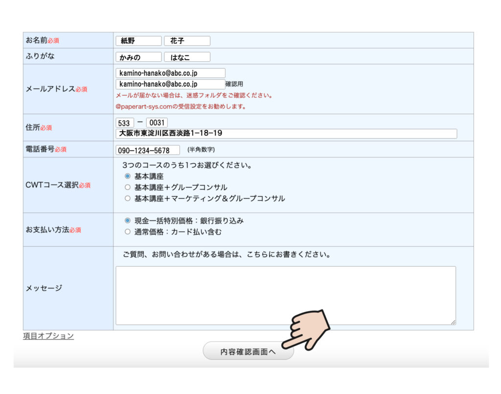 内容確認画面が出ますので、入力した内容に間違いがないか、ご確認ください